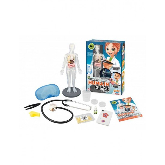 Ένα μοντέλο του ανθρώπινου σώματος, με μαλακά όργανα για χειρισμό και φωσφορίζοντα οστά. Ανακαλύψτε 12 πειράματα για να καταλάβετε τα μυστικά της ανατομίας: καλλιεργήστε βακτήρια, δημιουργήστε βλέννα και ακούστε την καρδιά σας να χτυπάει με το στηθοσκόπιο. Περιλαμβάνει πλήρες εγχειρίδιο με οδηγίες. ΗΛΙΚΙΑ 8+