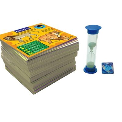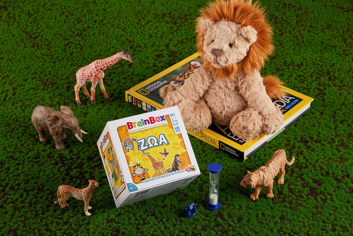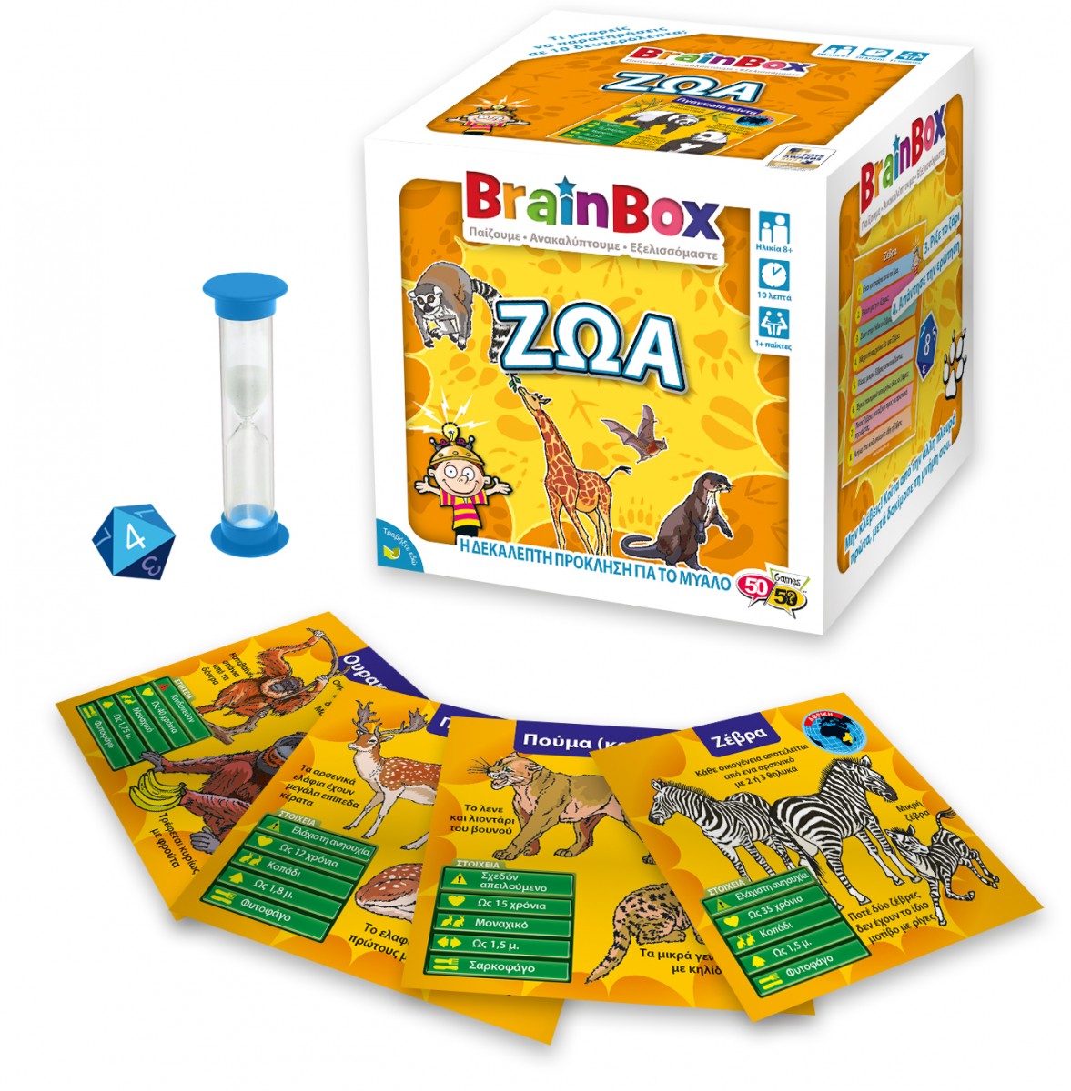 Εξερεύνησε το ζωικό βασίλειο με τον πιο διασκεδαστικό τρόπο! Διάλεξε μια κάρτα μέσα από το BrainBox. Αναποδογύρισε την κλεψύδρα και προσπάθησε να τη μάθεις απ’έξω μέσα σε 10 δευτερόλεπτα! Τώρα ρίξε το ζάρι και απάντα στην αντίστοιχη ερώτηση. Αν απαντήσεις σωστά κρατάς την κάρτα, αν απαντήσεις λάθος βάζεις την κάρτα και πάλι μέσα στο BrainBox.