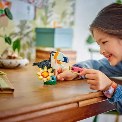 LEGO Creator 3in1 Wild Animals: Tropical Toucan (31173). Απολαύστε διασκέδαση με αυτό το πανέμορφο σετ κατασκευής LEGO Creator 3in1 Wild Animals: Tropical Toucan. Το LEGO Toucan κάθεται σε ένα κλαδί με ένα μεγάλο λουλούδι από τουβλάκια και μια φέτα καρπούζι, και για επιπλέον αξία παιχνιδιού μπορεί να κινήσει φτερά, ράμφος και τα φτερά της ουράς του. Τα παιδιά έχουν 3 διαφορετικές επιλογές κατασκευής LEGO ζώων με τα ίδια τουβλάκια: αρθρωτό τουκάν με μια φέτα καρπούζι που μπορεί να τοποθετηθεί στο ράμφος του, μια πολύχρωμη πεταλούδα με αρθρωτά φτερά που πετάει πάνω στη βάση της με γρασίδι και ένα λουλούδι, και ένα τροπικό ψάρι με αρθρωτά πτερύγια που μπορεί να περιστραφεί κατά 360 μοίρες πάνω στη βάση-βυθό της θάλασσας. Τα σετ LEGO Creator 3σε1 δίνουν έμπνευση στη δημιουργικότητα των παιδιών με 3 διαφορετικά μοντέλα για συναρμολόγηση σε κάθε κουτί. Τα παιδιά θα ενθουσιαστούν κατασκευάζοντας και ανακατασκευάζοντάς τα ξανά και ξανά. Τα σετ 3σε1 συνιστούν μια σειρά που ανταποκρίνονται στις μεγαλύτερες αγάπες των παιδιών, όπως σούπερ γρήγορα οχήματα, εκπληκτικά ζώα και σπίτια. Σημειώστε ότι τα μοντέλα δεν μπορούν να κατασκευαστούν ταυτόχρονα. Το σετ περιέχει 225 τεμάχια.