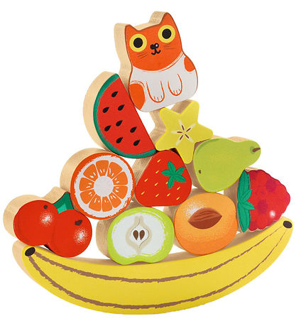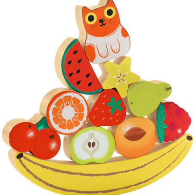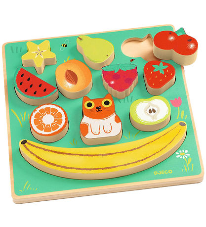 Διασκεδαστικό παζλ Djeco από ξύλο, με μοτίβα γάτας και φρούτων.