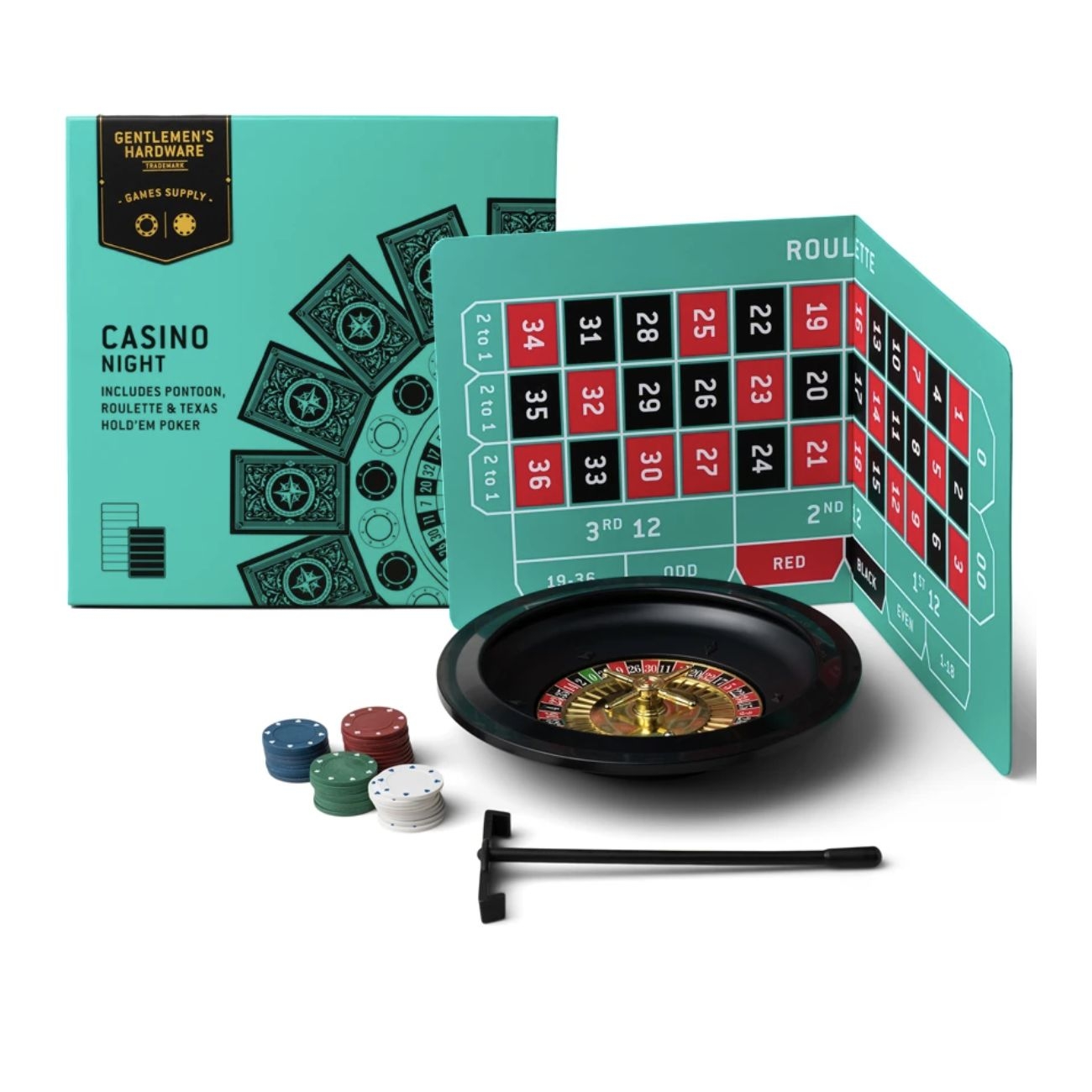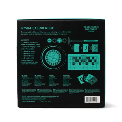 Φιλοξενήστε τη δική σας βραδιά καζίνο στο σπίτι! Ο πίνακας παιχνιδιού Casino Night έχει πλευρά πόκερ και ρουλέτα. Το σετ περιλαμβάνει επίσης δύο τράπουλες, 200 μάρκες πόκερ, έναν τροχό ρουλέτας, δύο μπάλες ρουλέτας, ένα κουμπί ντίλερ και ένα ραβδί κρουπιέρη.