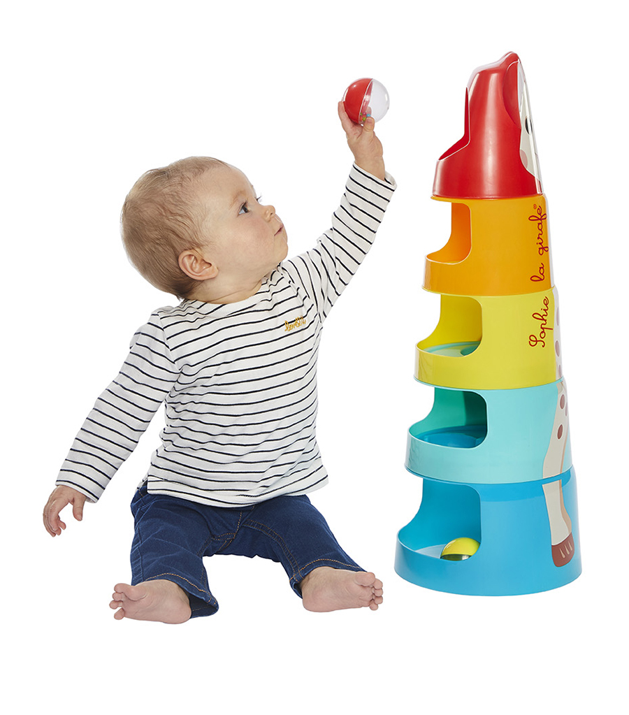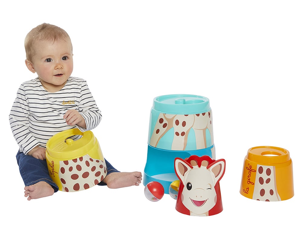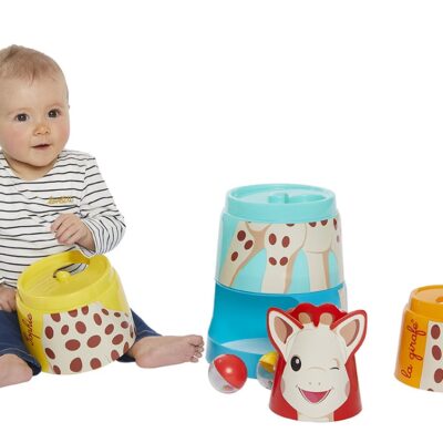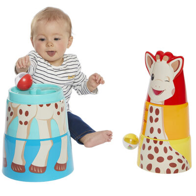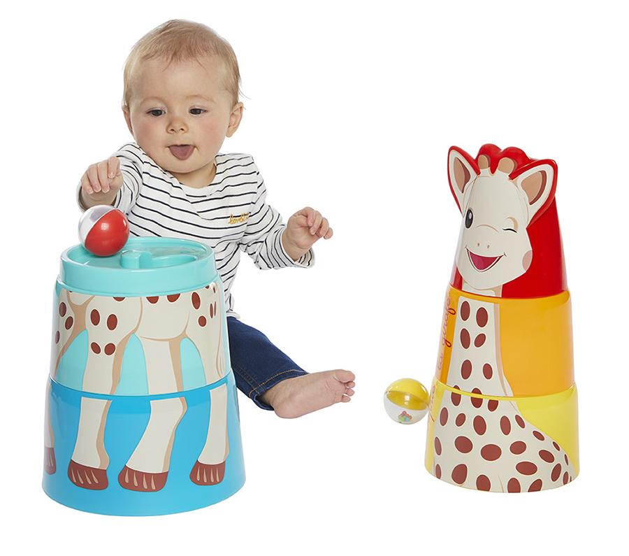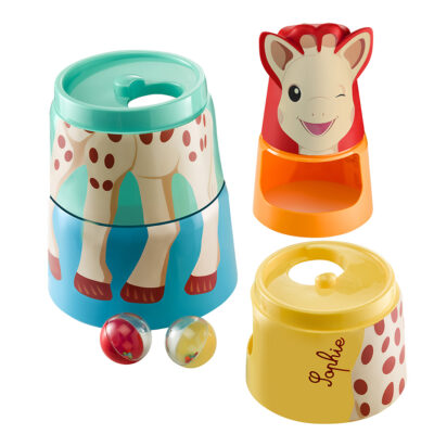 Πως; Στοιβάζεις τα 5 κομμάτια, από το μεγαλύτερο στο μικρότερο, φροντίζεις να ενώσεις σωστά όλα τα μέρη του σώματος της Σόφις και μόλις το ολοκληρώσεις μπορείς να αρχίζεις να ρίχνεις μέσα τις 2 μπαλίτσες (που είναι γεμάτες και κουδουνίζουν) και να προσπαθείς να τις πιάνεις όταν πέφτουν.