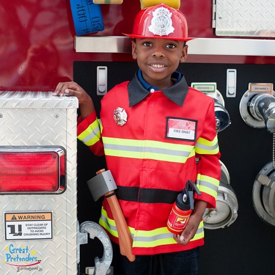 Οι πυροσβέστες της εταιρείας Great Pretenders ετοιμάζονται για την επόμενη αποστολή τους! Ο εξοπλισμός τους περιλαμβάνει σακάκι, κράνος τσεκούρι και πυροσβεστήρα όπου τοποθετείτε νερό για να μπορείτε να σβήσετε την φωτιά!