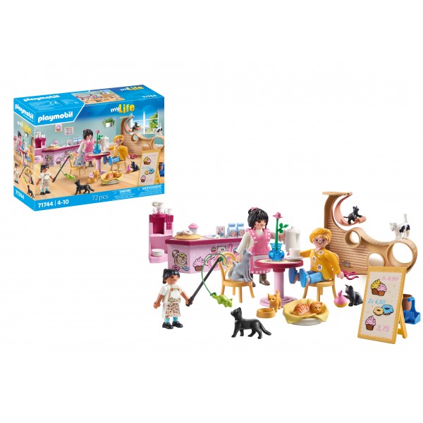 Ελάτε στην υπέροχη PLAYMOBIL Καφετέρια με γάτες, όπου ο καφές και οι αγκαλιές συναντιούνται! Οι επισκέπτες απολαμβάνουν cupcakes και καφέ σε ένα άνετο τραπέζι, ενώ οι παιχνιδιάρες γάτες εξερευνούν τον τοίχο αναρρίχησης, χαλαρώνουν στη κούνια ή κυνηγούν παιχνίδια. Με πολλές λεπτομέρειες όπως λεκάνη απορριμμάτων, στύλο γρατσουνίσματος και ακόμα και παιχνίδια για γάτες, η διασκέδαση για τους θαυμαστές των γατών δεν τελειώνει ποτέ!