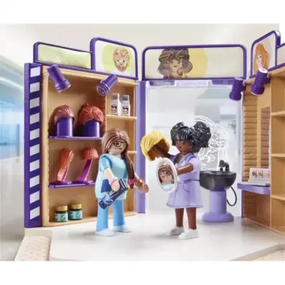 Περιλαμβάνει δύο φιγούρες PLAYMOBIL, καρέκλα με προσκέφαλο, καθρέφτη, λουτήρα, ψαλίδι, χτένα, πιστολάκι μαλλιών και πολλά προϊόντα περιποίησης.