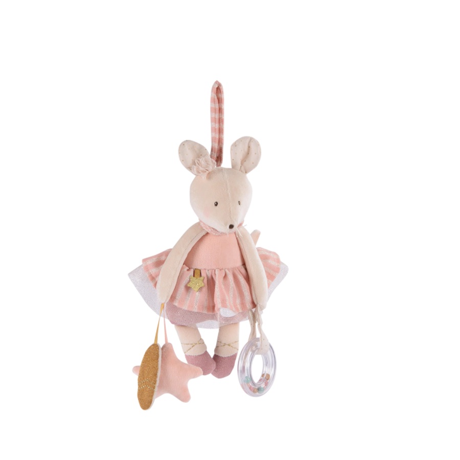 Κρεμαστή ποντικίνα δραστηριότητας που φέρει μαζί του πολλές εκπλήξεις για να ενθουσιάσει το μωρό! Στο πόδια της κρατά έναν κρίκο με μπάλα. ένα αστέρι, ένα φύλλο που ακούγεται σαν τσαλακωμένο χαρτί και κρύβει έναν καθρέπτη κάτω από την τουτού της.