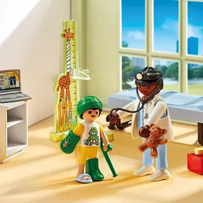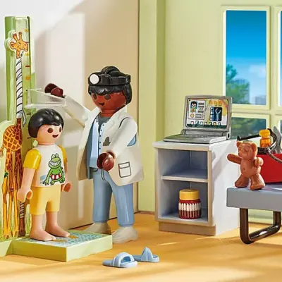Στο Παιδιατρείο οι μικροί ασθενείς αναρρώνουν γρήγορα. Ένα λούτρινο αρκουδάκι τους κρατά συντροφιά στις εξετάσεις. Το σετ παιχνιδιού περιλαμβάνει κρεβάτι εξέτασης, ζυγαριά για τη μέτρηση του ύψους, και διάφορους επιδέσμους.