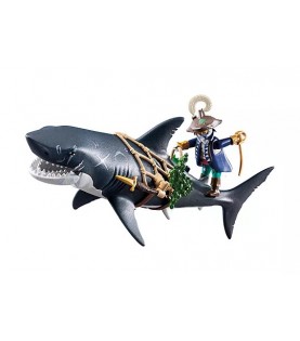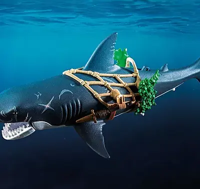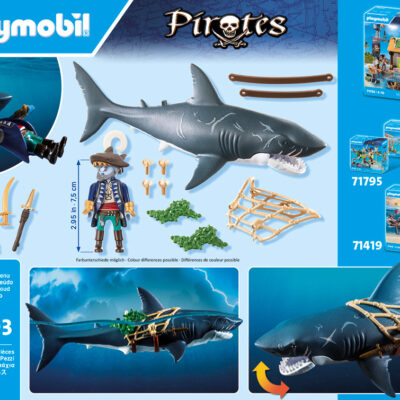Βυθιστείτε σε συναρπαστικές θαλάσσιες περιπέτειες με το PLAYMOBIL Πειρατής με γιγαντιαίο Καρχαρία! Αυτό το τρομακτικό δίδυμο είναι έτοιμο να τρομοκρατήσει τα νερά. Το σαγόνι του γιγαντιαίου καρχαρία μπορεί να παγιδεύσει το ανυποψίαστο θήραμα, ενώ ο τολμηρός πειρατής κρέμεται από το δίχτυ, οπλισμένος με μαχαίρια και έτοιμος για μάχη. Με όπλα που προσαρμόζονται στο δίχτυ και έναν κολυμβητικό καρχαρία, η δράση δεν σταματά ποτέ.