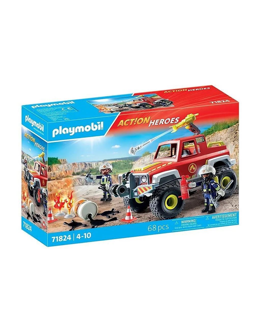 Γρήγορα! Ελάτε στη διάσωση με το παντός εδάφους PLAYMOBIL Πυροσβεστικό Όχημα 4×4! Σχεδιασμένο για δύσκολες αποστολές, αυτό το πυροσβεστικό όχημα είναι γεμάτο με συναρπαστικά χαρακτηριστικά. Η αποσπώμενη οροφή επιτρέπει να καθίσουν δύο πυροσβέστες, ενώ οι κηλίδες λαδιού και οι φλόγες προσθέτουν επιπλέον δράμα σε κάθε σκηνή.