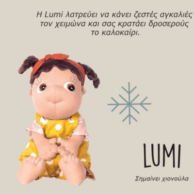 Η κουκλίτσα Lumi από την οικογένεια Rubens Tummies, αγαπάει την ζέστη και τις χουχουλιάρικες αγκαλιές. Κατάλληλη από νεογέννητα και για κάθε ηλικία είναι μία πανέμορφη κούκλα για να κρατάει συντροφιά, να δίνει παρηγοριά και ανακούφιση.