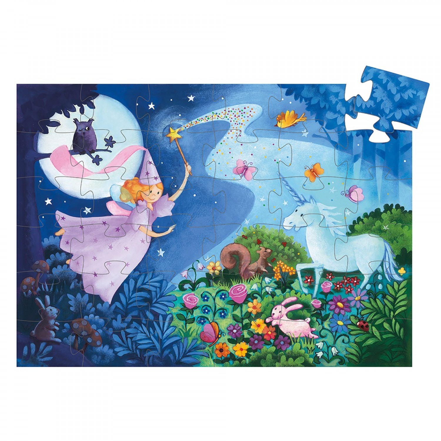 Η νεράιδα της εταιρίας Djeco με μια κίνηση του ραβδιού της μετατρέπει τη νύχτα σε μέρα! Ο μονόκερος της παίζει ανέμελα ανάμεσα στα λουλούδια τις πεταλούδες και τα λαγουδάκια! Ένα παραμυθένιο πάζλ 36 τεμαχίων, για παιδιά ηλικίας 4 ετών και άνω.