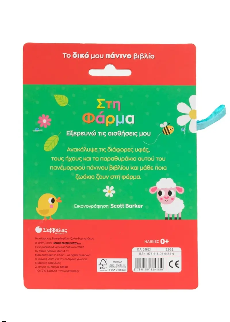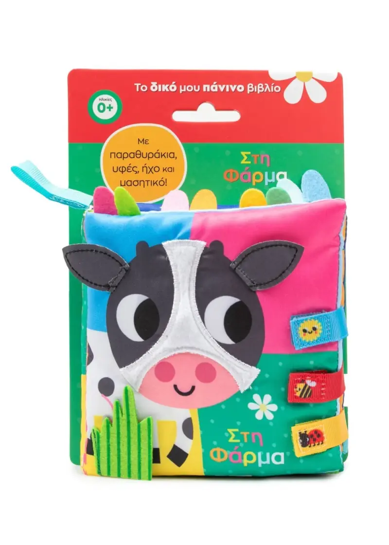 Ανακάλυψε τις διάφορες υφές, τους ήχους και τα παραθυράκια αυτού του πανέμορφου πάνινου βιβλίου και μάθε ποια ζωάκια ζουν στη φάρμα! Μέσα από το παιχνίδι, το παιδί αναπτύσσει τη φαντασία του, τη λεπτή κινητικότητα και τις αισθήσεις του. Με ζωηρά χρώματα, μαλακά υφάσματα και χαριτωμένα σχέδια, το βιβλίο αυτό είναι ιδανικό για βρεφική και προσχολική ηλικία.