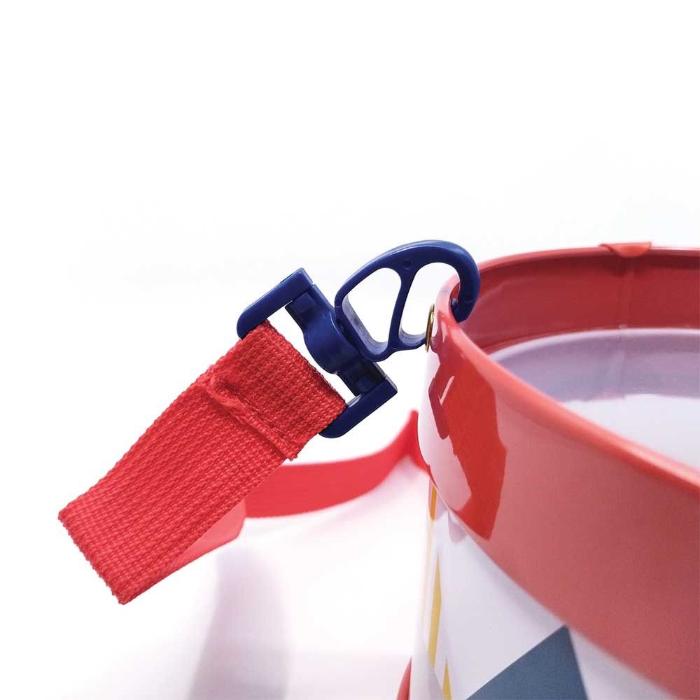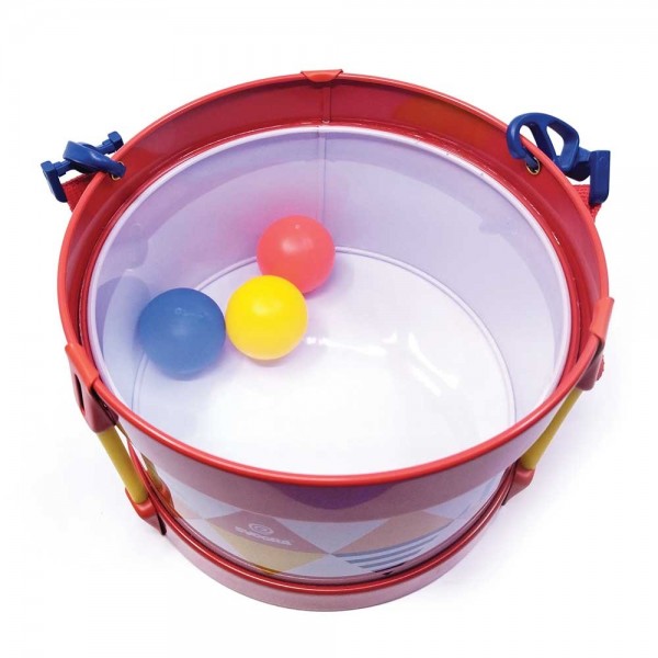 Διαθέτει υφασμάτινο ιμάντα για να τοποθετείται γύρω από το λαιμό των μικρών τυμπανιστών και 2 μπαγκέτες.